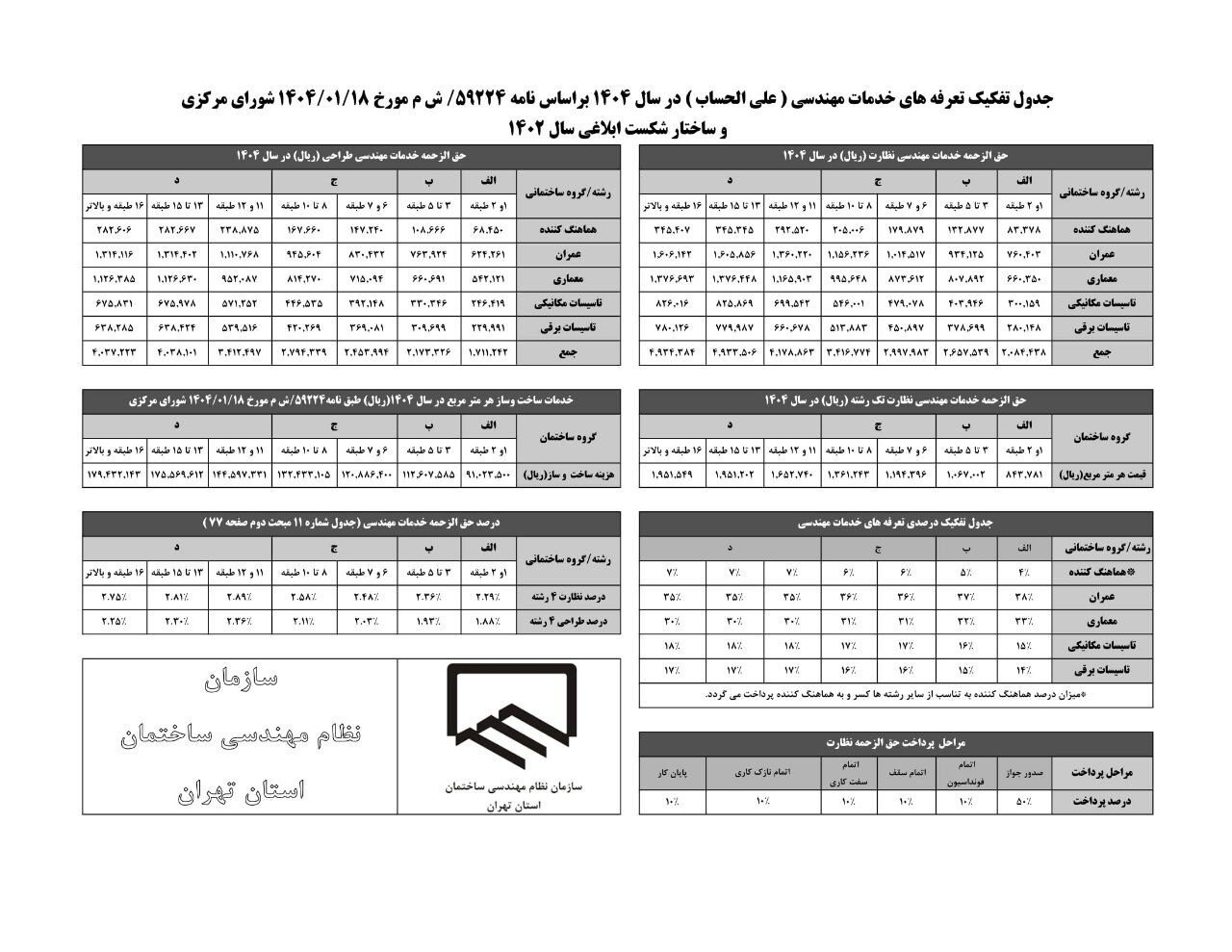 جدول تعرفه حق الزحمه خدمات مهندسی ساختمان سازمان نظام مهندسی 1404